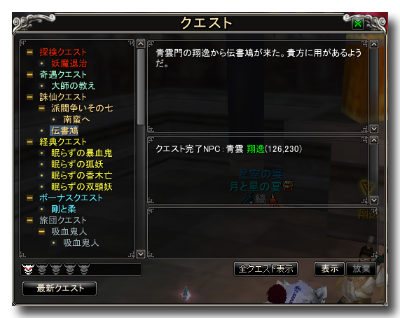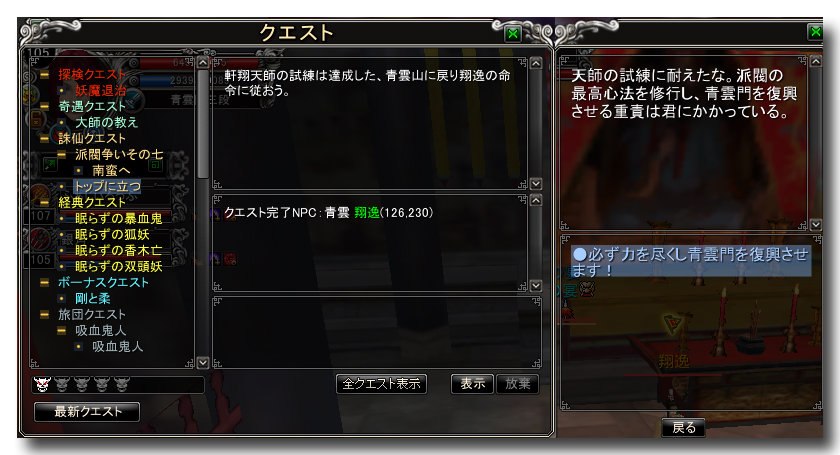 青雲門の四段昇段クエストの初めは、青雲の翔逸から始まります。