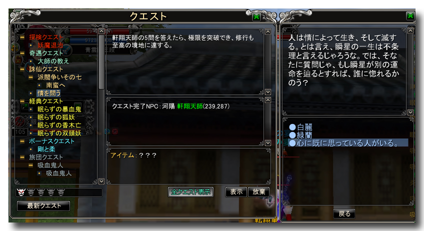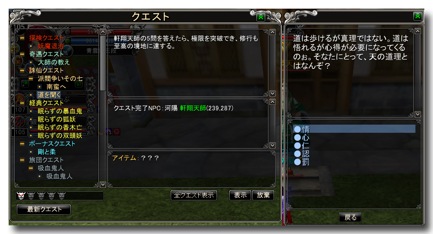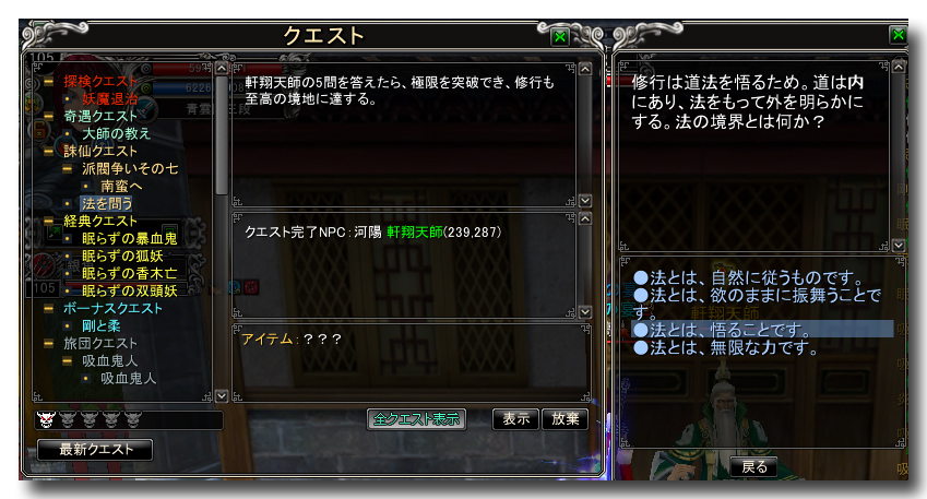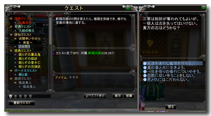 この選択肢の後、クエストアイテムイベントリに"悟り"が勝手に入り勝手に消費されます。